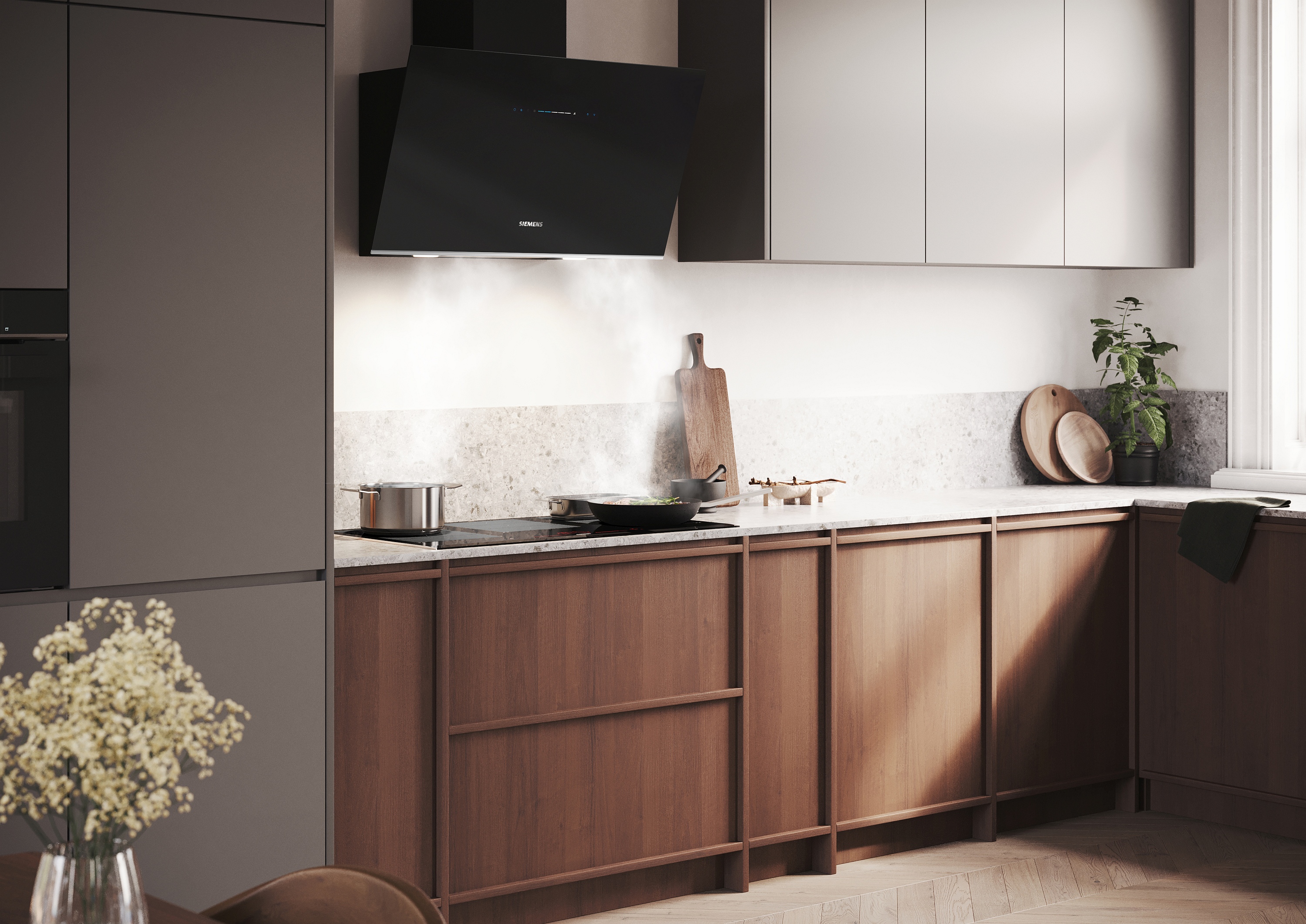 Ob wandmontiert, über einer Kücheninsel hängend, in ein Kochfeld integriert oder in der Arbeitsplatte versenkt – die hochmodernen Lüftungssysteme und Dunstabzugshauben von Siemens sorgen für eine geräuscharme und dampffreie Umgebung, in der Sie Ihre kulinarischen Ambitionen verwirklichen können. Entdecken Sie charakteristisches Design und starke Leistung für jede Küchenanordnung in der Siemens Produktpalette für Lüftungslösungen.